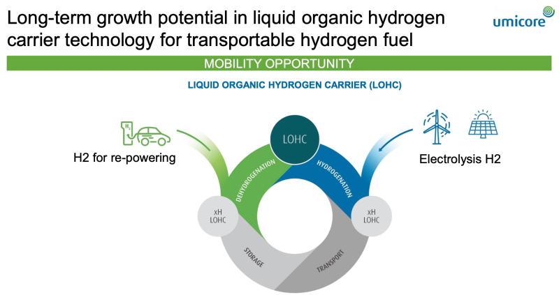 أعلنت شركة Umicore و Anglo American عن اتفاقية تعاون في مجال البحث والتطوير لتطوير محفزات مجموعة البلاتين المعدنية القائمة على PGM لتطبيقات ناقل الهيدروجين العضوي السائل (LOHC) في السيارات الكهربائية و التي تعمل بخلايا الوقود و كذلك تطبيقات النقل الأخرى . تتمتع تقنية المحفز هذه بالقدرة على تغيير الطريقة التي يمكن بها تخزين الهيدروجين واستخدامه لتشغيل السيارات الكهربائية.