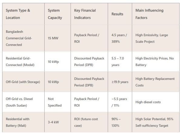 في دول مثل مالي، حيث تسعى الأسر إلى مستويات عالية من الاكتفاء الذاتي، تُظهر الأنظمة السكنية الصغيرة (3–4 كيلوواط) المدمجة مع بطاريات عوائد تتراوح بين 90% و130% في سيناريوهات التكاليف المستقبلية.