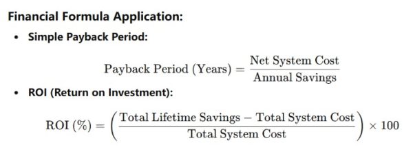 أولًا، تبدأ بتقدير التكلفة الصافية للنظام بعد الحوافز والدعم المتاح. على سبيل المثال، نظام بقدرة 5 كيلوواط قد تبلغ تكلفته الاسمية 19,000 دولار، لكنها تنخفض إلى نحو 13,300 دولار بعد خصم الحوافز.