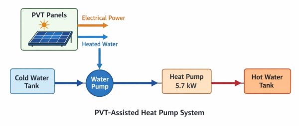 يعتمد النظام المدروس على تدوير الماء عبر ألواح PVT لامتصاص الحرارة وتبريد الخلايا الشمسية في الوقت نفسه. ينتقل الماء بعد ذلك إلى خزان ماء بارد، يحتوي على ملف يعمل كمبخر للمضخة الحرارية. تقوم المضخة بنقل الحرارة إلى خزان المياه الساخنة عبر مكثف صفائحي، بينما تُستخدم الكهرباء المولدة من ألواح PVT لتشغيل الضاغط والمضخات، مع الاعتماد على الشبكة عند الحاجة.