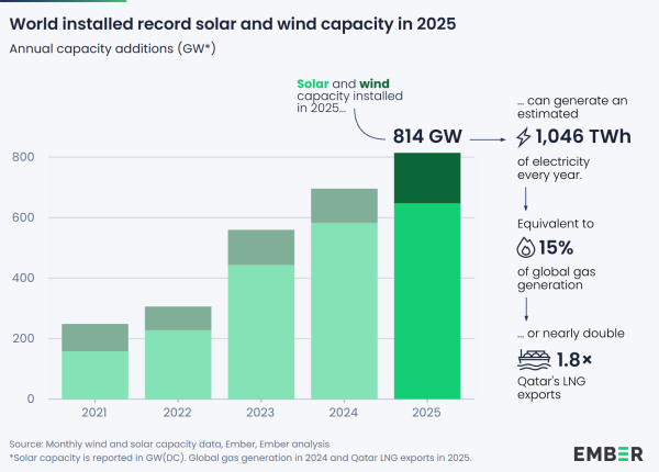 وفقًا لتقرير صادر عن Ember، بلغ إجمالي الإضافات الجديدة من الطاقة الشمسية وطاقة الرياح في عام 2025 نحو: