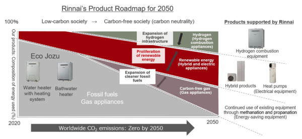 الجدير بالذكر أن Rinnai هي شركة يابانية لتصنيع أجهزة التدفئة المنزلية وقد احتلفت على مرور 100 عام على تشغيلها في عام 2020. وقد أعلنت في نوفمبر 2021 عن خارطة طريق للابتكار 2050 (سمتها RIM 2050) ، والتي تهدف بالتزامها بالحياد الكربوني. وذلك حرصا منها على الحد من الاحتباس الحراري في جميع أنحاء العالم لتحقيق مجتمع خالٍ من الكربون. خصوصا أنها شركة تتعامل مع الأجهزة المنزلية التي تعتمد بشكل أساسي على الوقود الأحفوري (الغاز و الكهرباء).