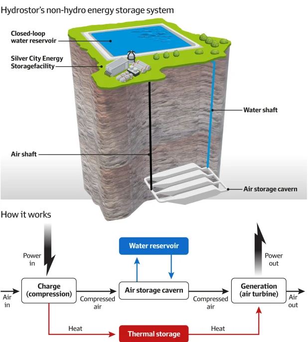 فأثناء الشحن، يتم جمع الحرارة من الهواء المضغوط وتخزينها قبل أن يدفع الهواء المبرد المياه خارج كهف تحت الأرض إلى خزان مياه على السطح. أما عند التفريغ، يتدفق الماء مرة أخرى إلى الكهف ما يجبر الهواء على الصعود إلى السطح تحت الضغط حيث يتم تسخينه باستخدام الطاقة الحرارية المخزنة ويدير التوربين لتوليد الكهرباء.